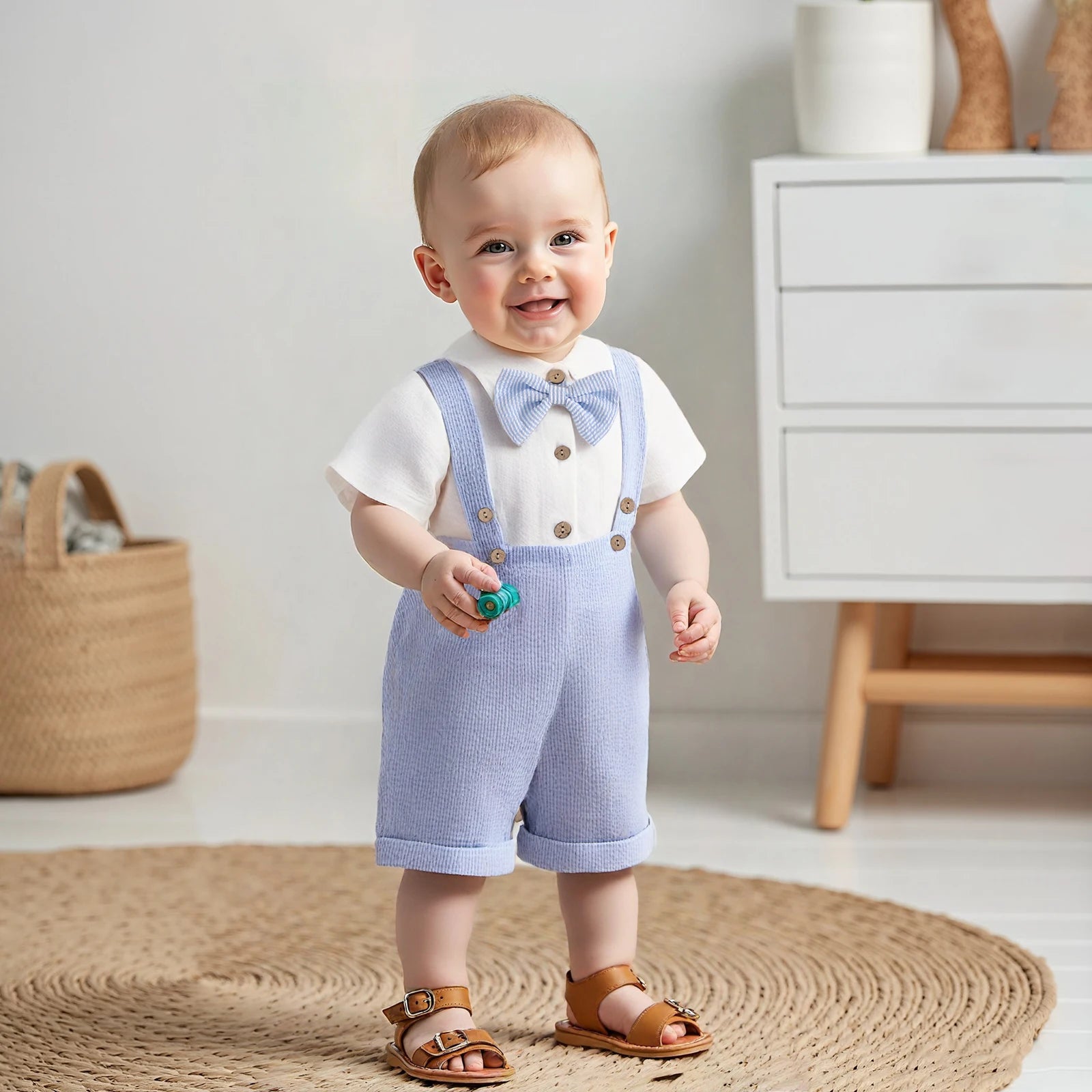 Baby Boys Gentleman 3 PieceSets Solid Short Sleeve Lapel Neck Romper Stripe Suspender Shorts Bowtie